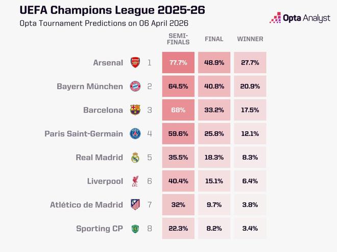欧冠1/4决赛首回合周中开打,知名数据机构Opta于赛前更新了八支参赛队伍晋级四强的概率。